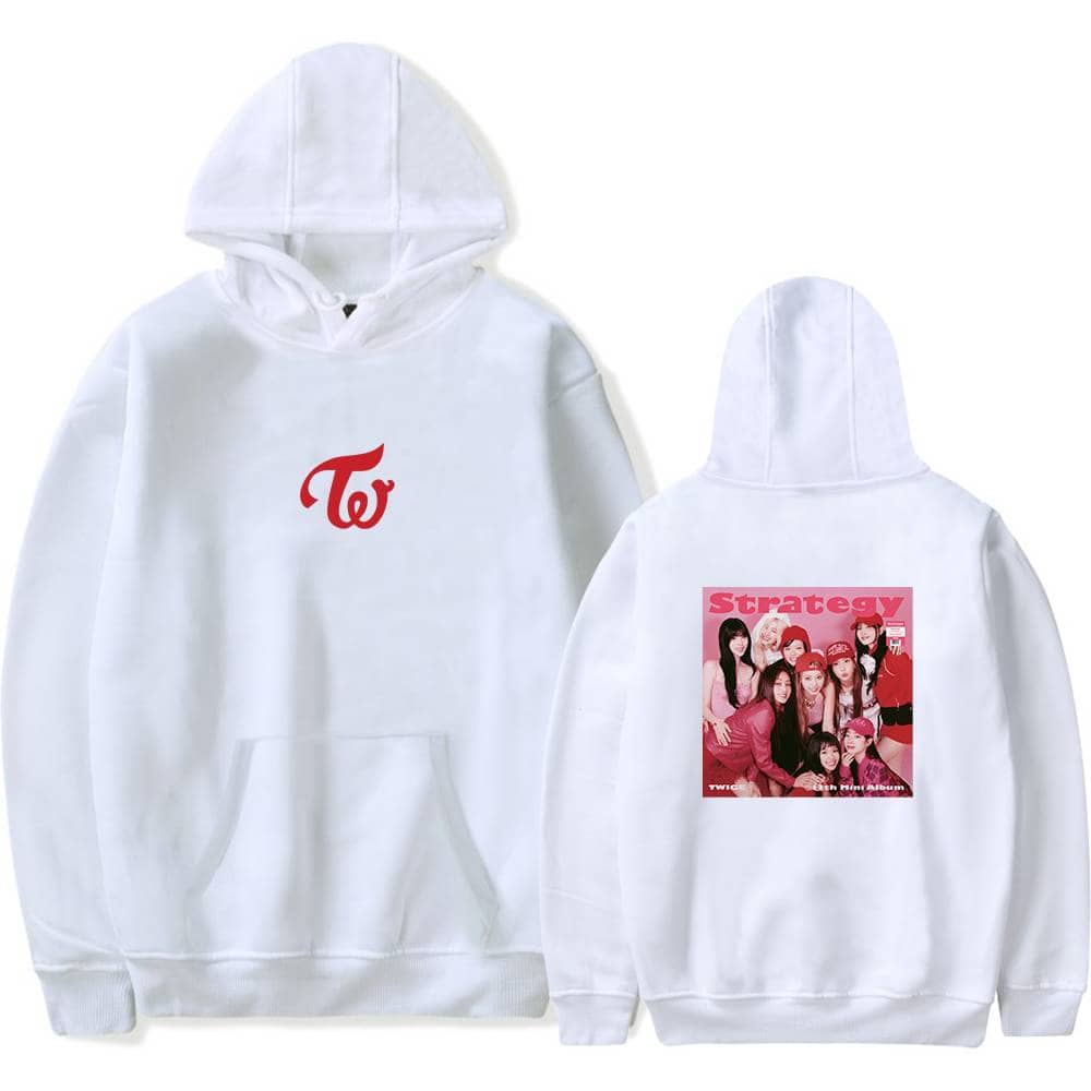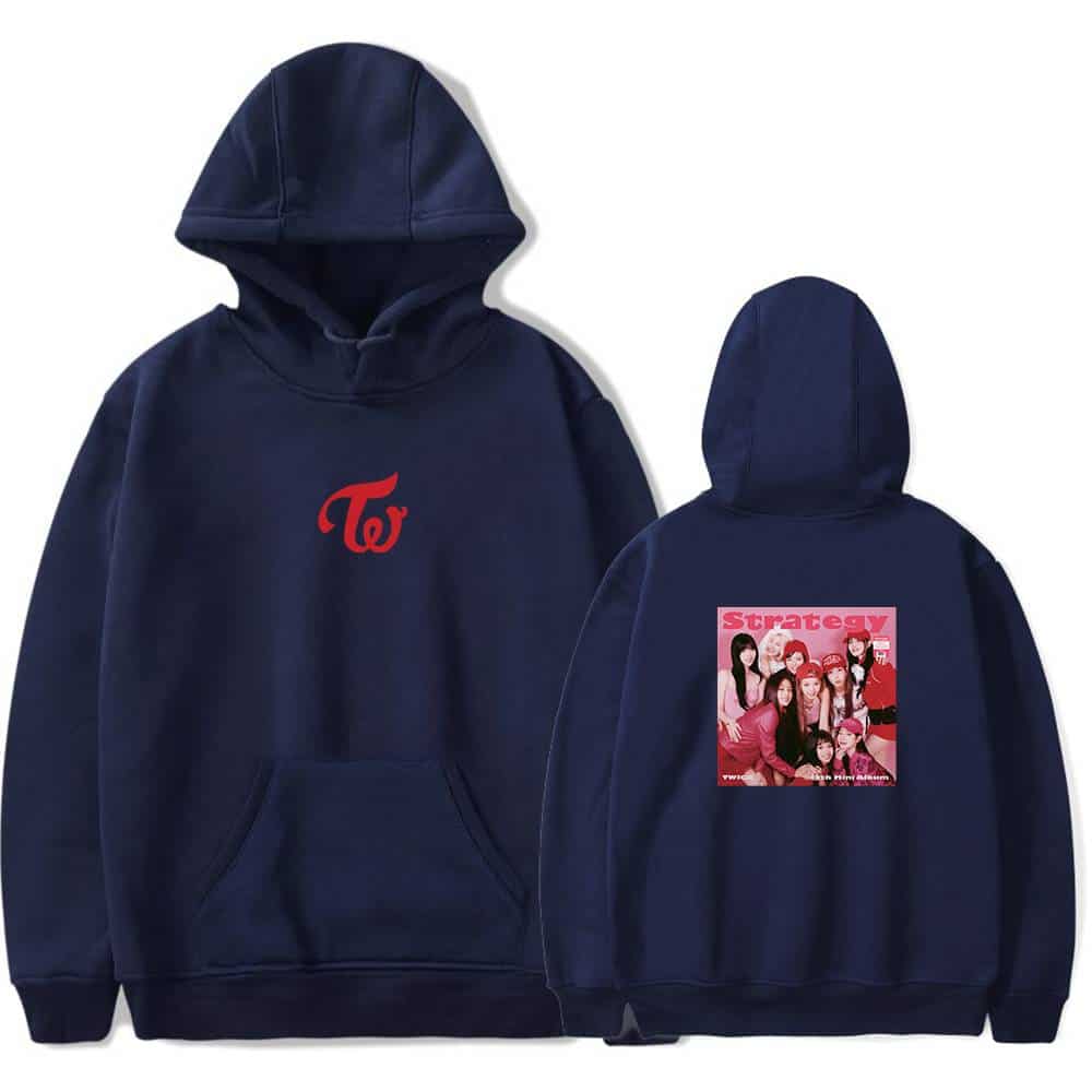 Twice kpop merch black hoodie with TW logo and group photo graphic on back, perfect for fans of the girl group. stylish and comfortable, great for casual wear or concert souvenirs. TWICE Kpop merch hoodie with front TW logo and back image of TWICE members with "Strategy" text, perfect for fans of the girl group. Ideal for showcasing your love for TWICE in style.